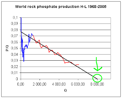 Current reserves are more than twice the claimed URR. So clearly this Hubbert-Linearization has been cooked for propaganda purposes. In fact, since cumulative production to date is about 6 billion metric tons, the area under the red curve in Fig. 1 is going to have to be at least three times larger than shown (6 to date + 18 reserves = 24). And that's just counting reserves -- i.e. phosphate which can be economically extracted with current technology.