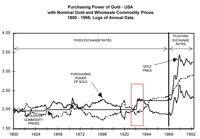 Note from the author's graph the step function in the price of gold after FDR confiscates it and reprices it in 1933.