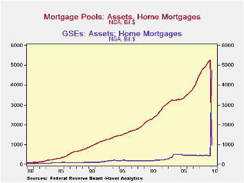 The FASB's new accounting rules 166 and 167 on the use of off-balance sheet accounting for securitized debt issues took effect at the beginning of 2010 for financial institutions with a calendar year fiscal year. From a data user's perspective, earlier this year, they were reflected in changes to commercial bank balance sheet data, and last week, with the release of the Q1 Flow-of-Funds data, we saw their impact more broadly on banks, GSEs and the special purpose vehicles (SPVs) these rulings were intended to reform.